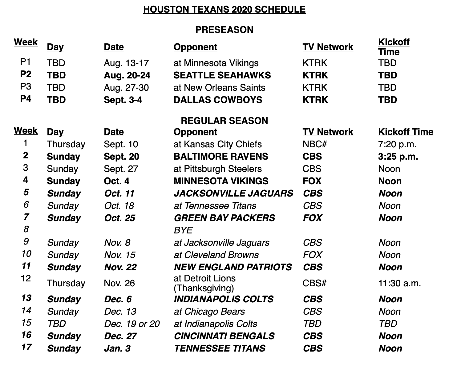 Houston texans 2020 schedule recap houston texans. All games played on sundays unless otherwise noted.